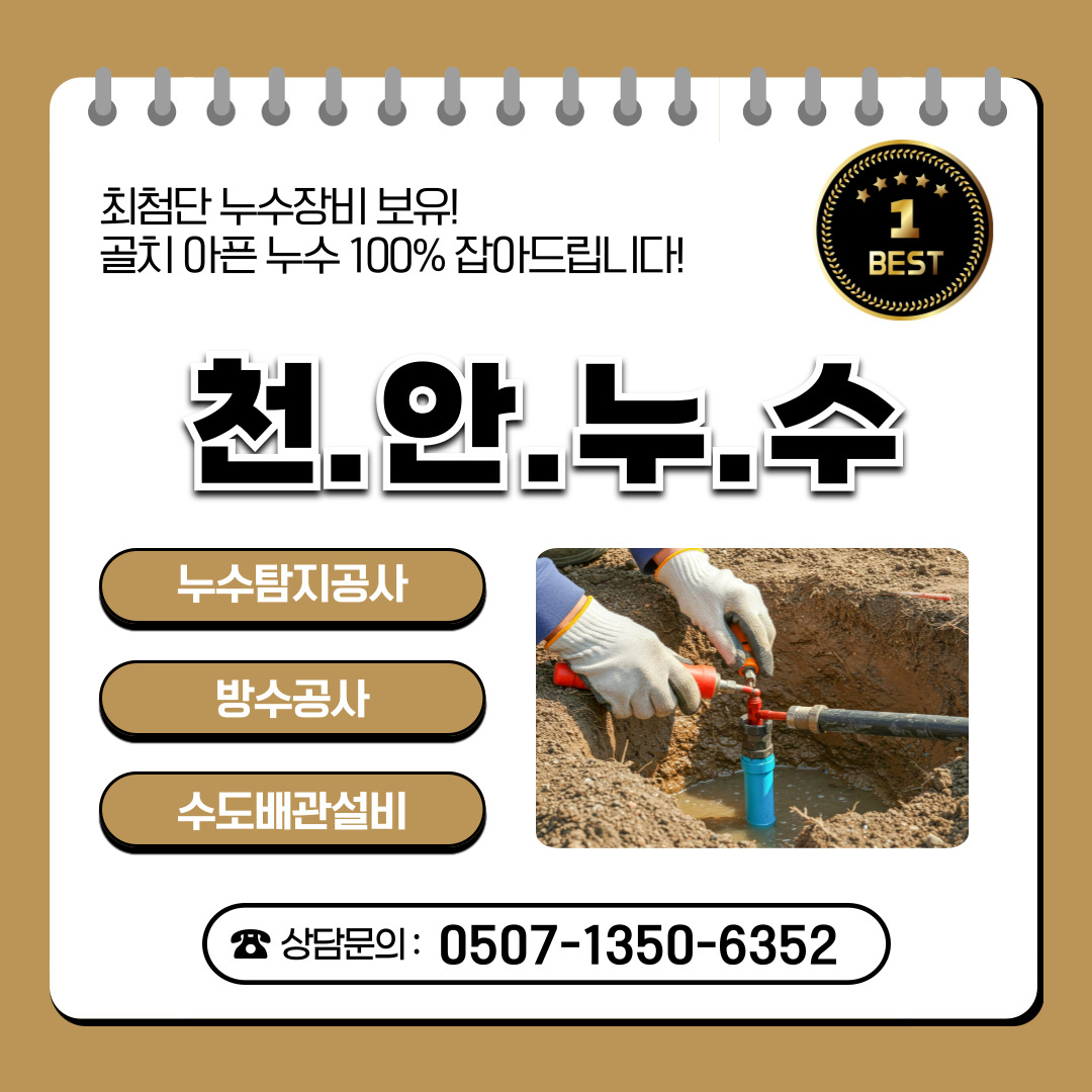 특히 천안 지역은 다양한 연식의 주택들이 혼재되어 있어, 배관 노후화나 구조적인 문제로 인한 누수의 위험이 상존합니다. 혹시 벽지 뒤쪽에서 느껴지는 미세한 습기, 평소보다 갑자기 오른 수도 요금, 혹은 희미하게 들리는 '똑똑'거리는 소리 때문에 마음이 불편하지 않으신가요? 이러한 작은 징후들이 나중에 벽 전체를 뜯어내야 하는 대형 사고로 발전하는 것을 막기 위해, 저는 오늘 천안누수 초기 증상과 점검 방법 정리를 통해 여러분이 전문가 수준으로 집을 관찰할 수 있도록 돕고자 합니다. 이 글을 통해 여러분은 더 이상 누수 문제로 인한 불안감에 시달리지 않고, 신속하고 정확하게 대처할 수 있는 지혜를 얻게 될 것입니다. 천안누수 초기 증상과 점검 방법 정리의 핵심을 놓치지 마시기 바랍니다. 이 모든 과정은 여러분의 재산 보호를 위한 가장 확실한 방어선이 될 것입니다. 1. 육안으로 확인 가능한 가장 흔한 천안누수 초기 증상 천안누수 초기 증상과 점검 방법 정리에 있어 가장 먼저 확인해야 할 부분은 눈에 보이는 변화입니다. 벽지나 천장에 나타나는 얼룩은 가장 대표적인 신호입니다. 처음에는 작은 물방울 자국처럼 보이다가 시간이 지나면서 갈색이나 황토색으로 변색되는데, 이는 물이 스며든 지 꽤 시간이 흘렀음을 의미합니다. 또한, 벽지나 페인트가 들뜨거나 부풀어 오르는 현상도 놓치지 말아야 합니다. 이 현상은 벽 내부의 습도가 비정상적으로 높아졌다는 명백한 증거입니다. 또 다른 중요한 육안 확인 사항은 바닥재의 변화입니다. 특히 장판이나 마루의 경우, 특정 부위만 볼록하게 솟아오르거나 밟았을 때 푹 꺼지는 느낌이 든다면, 그 아래에 고여 있는 물이나 습기로 인한 구조적 변형일 가능성이 높습니다. 곰팡이 발생 역시 천안누수 초기 증상과 점검 방법 정리 리스트에서 빠질 수 없습니다. 곰팡이는 단순히 습도가 높은 곳에 생기는 것이 아니라, 지속적으로 물이 공급되는 곳에서 빠르게 번식합니다. 욕실이나 베란다 주변에서 검은색 또는 녹색의 곰팡이가 유독 심하게 발견된다면, 배관이나 방수층에 문제가 생겼을 확률이 매우 높습니다. 2. 소리와 냄새로 감지하는 숨겨진 천안누수 신호 눈에 보이지 않는 곳에서 발생하는 누수는 소리와 냄새로 우리에게 경고를 보냅니다. 천안누수 초기 증상과 점검 방법 정리를 할 때 청각과 후각을 활용하는 것이 중요합니다. 가장 흔한 소리는 '똑, 똑' 혹은 '졸졸'거리는 물 흐르는 소리입니다. 이 소리가 특히 밤처럼 주변 소음이 줄어들었을 때 유난히 크게 들린다면, 배관 내부의 압력 변화나 미세한 파열음을 포착한 것일 수 있습니다. 냄새의 경우, 곰팡이 냄새와는 구별되는 독특한 '눅눅함'이나 '흙냄새'가 느껴진다면 이는 벽체 내부나 바닥 아래에 고인 물이 정체되어 발생하는 냄새일 가능성이 큽니다. 특히 난방 배관이나 온수 배관에서 누수가 발생하면, 따뜻해진 물이 섞여 특유의 비릿하거나 퀘퀘한 냄새가 집안 전체에 퍼질 수 있습니다. 천안누수 초기 증상과 점검 방법 정리 시, 조용한 시간에 집안 구석구석을 걸어 다니며 귀 기울여 듣고 코를 킁킁거리는 습관은 초기 발견에 결정적인 역할을 합니다. 3. 계량기를 이용한 비파괴적 누수 점검 방법 전문가들이 가장 먼저 시도하는 천안누수 초기 증상과 점검 방법 정리의 핵심은 '계량기 테스트'입니다. 이는 배관 자체의 압력이나 사용량을 확인하여 누수 여부를 비파괴적으로 판단하는 가장 확실한 방법입니다. 테스트 방법은 간단합니다. 집안의 모든 수도꼭지를 잠그고, 물을 사용하는 가전제품(세탁기, 식기세척기 등)의 작동을 멈춥니다. 그 후, 수도 계량기의 작은 원판(혹은 별 모양의 움직이는 부분)을 주의 깊게 관찰합니다. 만약 모든 물 사용을 중단했는데도 계량기의 원판이 계속 돌아가고 있다면, 이는 어딘가에서 물이 지속적으로 흐르고 있다는 명백한 증거입니다. 이 테스트는 특히 야간이나 새벽처럼 사용량이 적은 시간에 진행했을 때 정확도가 높아집니다. 천안누수 초기 증상과 점검 방법 정리에서 계량기 테스트는 누수의 존재 유무를 확인하는 1차 관문이며, 만약 이상이 발견되었다면 누수가 옥내 배관인지, 혹은 공용 배관인지를 구분하는 데도 도움을 줍니다. 4. 수도 요금 변화를 통한 이상 징후 포착 재정적인 측면에서 천안누수 초기 증상과 점검 방법 정리를 시도할 수 있습니다. 평소 생활 패턴에 변화가 없었음에도 불구하고 갑자기 수도 요금이 평소보다 20~30% 이상 급격하게 증가했다면, 이는 누수를 의심해야 할 강력한 신호입니다. 특히 화장실을 한 번도 사용하지 않은 것처럼 느껴지는 달에 평소보다 높은 요금이 나왔다면 더욱 그렇습니다. 하지만 단순히 수도 요금만으로 단정하기는 어렵습니다. 다른 세대와 함께 사용하는 공용 계량기일 경우, 다른 세대의 사용량이 포함될 수 있기 때문입니다. 따라서 이 방법은 보조적인 수단으로 활용되어야 합니다. 천안누수 초기 증상과 점검 방법 정리의 일환으로, 계량기 테스트와 수도 요금 변화를 교차 검증하여 누수의 가능성을 높이는 것이 현명합니다. 만약 누수가 의심된다면, 온수 사용